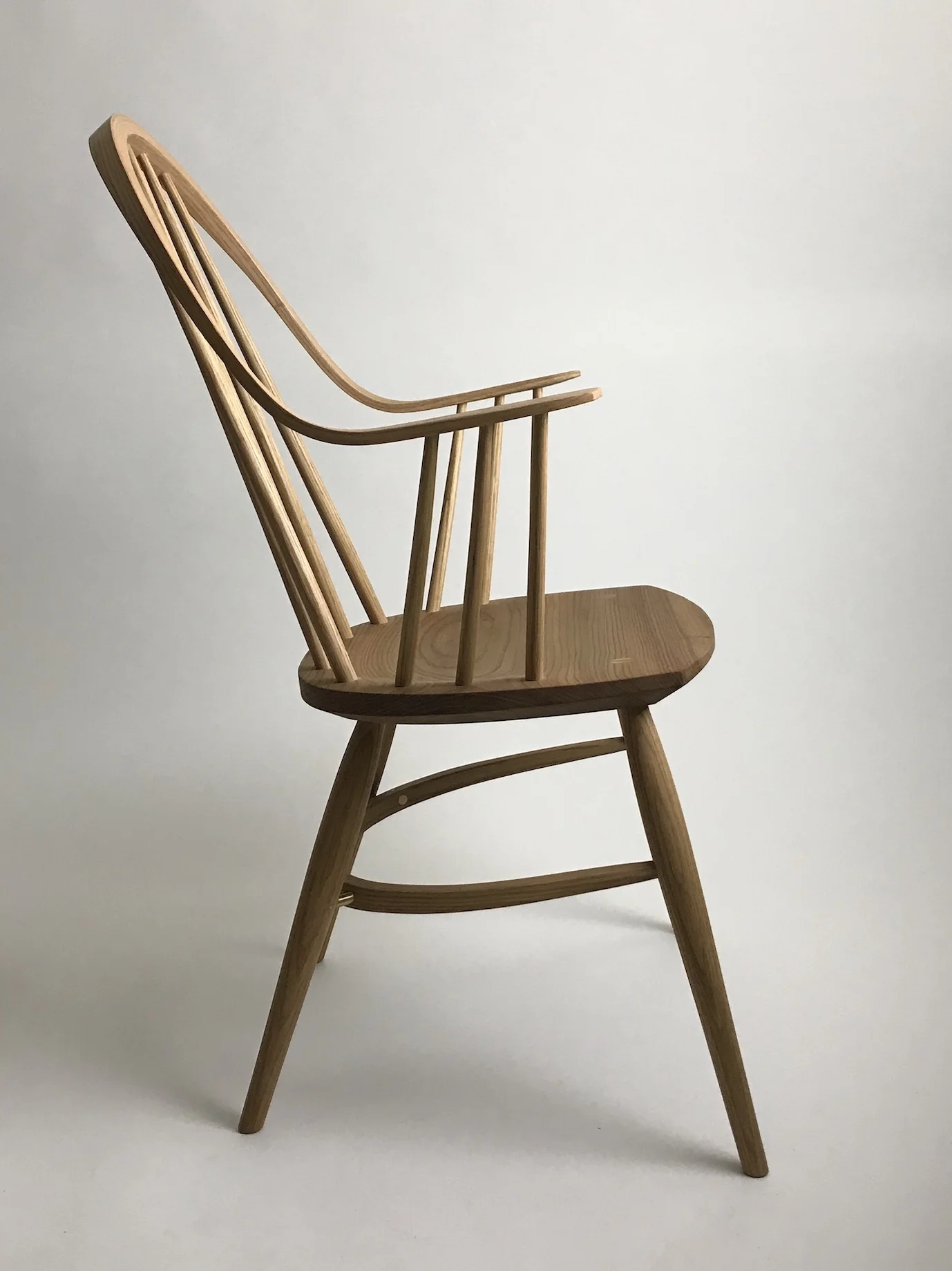 Based on the historic Welsh Stick chair this dining/armchair has a one piece steambent arm rail and as with the seat and spindles it is carved and shaped by hand. Part of the ‘windsor modern’ brand this chair evokes both the simplicity of it’s Welsh origins and the sophistication of mid-century modern.